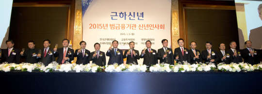 '2015년 범금융기관 신년인사회'가 열린 5일 서울 소공동 롯데호텔 크리스탈볼룸에서 참석자들이 건배를 하고 있다. 사진 왼쪽부터 신학용 새정치민주연합 의원, 김문호 전국금융산업노조 위원장, 김기준 새정치민주연합 의원, 신제윤 금융위원장, 이주열 한국은행 총재, 박병석 새정치민주연합 의원, 최경환 경제부총리 겸 기획재정부 장관, 하영구 전국은행연합회장, 정우택 국회 정무위원장, 김기식 새정치민주연합 의원, 강석훈 새누리당 의원, 추경호 국무조정실장, 진웅섭 금융감독원장, 박종수 금융투자협회장, 이수창 생명보험협회장, 장남식 손해보험협회장.