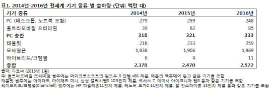 한편 PC, 태블릿, 울트라모바일, 모바일폰을 합친 올해 전세계 기기 총 출하 대수는 25억대로, 전년 대비 3.9%의 증가율을 기록할 전망이다. 모바일폰 시장은 올해 3.7% 성장하며 2016년 20억대에 도달할 것으로 보인다.