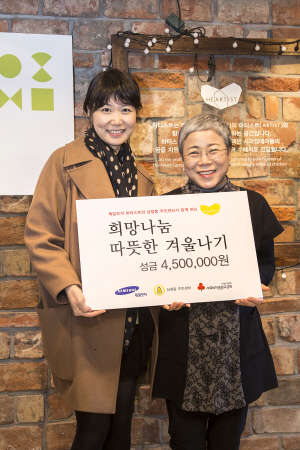 제일모직 CSR팀 이경화 부장(왼쪽)이 8일 서울 종로구 삼청동 CSR매장 하티스트하우스에서 삼청동주민센터 김영희 동장에게 '2015 희망나눔 따뜻한 겨울나기 사업'에 임직원 기부금을 전달하고 있다. 기부금은 삼청동에 거주하는 기초생활수급자, 한부모가정 등 저소득층의 생계비와 응급구호비로 쓰일 예정이다.