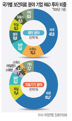 유럽연합 집행위원회가 최근 발표한 '유럽연합 산업R&D 투자 스코어보드 2013'에 따르면 글로벌 R&D 투자 2500대 기업 중 보건의료 분야 기업은 391개사로 총 1086억유로(약 140조3000만원)를 투자해 전체 업종 중 가장 높은 20.2%의 연구개발비 비중을 차지했다. 이 중 제약기업은 294개사로 총 969억유로를, 의료기기 분야는 97개사가 177억유로를 투자해 각각 18%와 2.2%의 비중을 나타냈다.