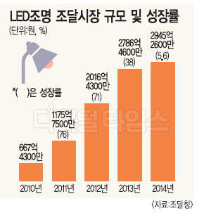 LED 조명 조달시장 규모는 2010년 660억원에서 2011년 1175억원, 2012년 2016억원, 2013년 2786억원으로 성장했으며 지난해 2945억원을 기록했다. 성장률은 시장이 형성되기 시작한 2011년 76%, 2012년 71%로 높게 나타났으며 2013년 38%, 2014년 5.6%로 둔화된 모습이다.