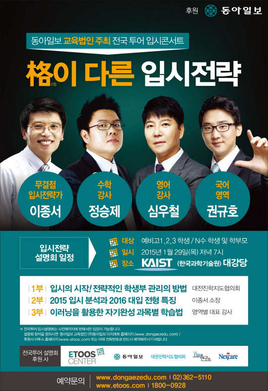 <格이 다른 입시전략-성적이 오르는 공부!! 대학이 보이는 전략!!> 을 주제로, 동아일보 교육법인 ㈜동아이지에듀가 주최하고 동아일보사와 이투스센터(최상위권 자기완성 학습센터)가 후원하는 신학기 대전지역 입시설명회가 1월 29일(목) 오후 7시, 대전 카이스트(KAIST) 대강당에서 개최된다.