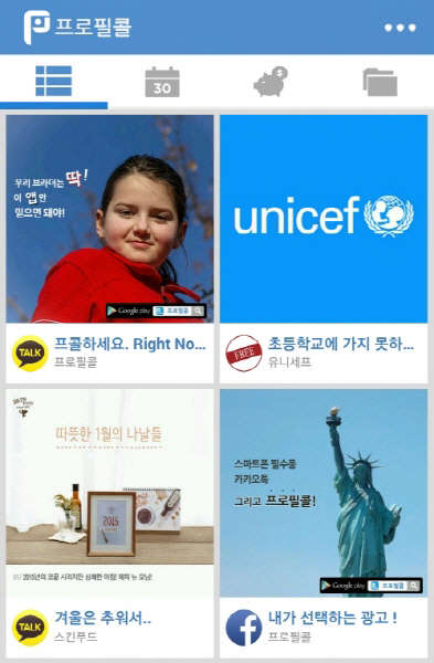 한편 프로필콜(www.profilecall.com)은 네이티브 광고가 판을 치는 모바일 광고 분야에서 착한 '공유경제' 모델로 주목 받고 있는 가운데 복지재단 무료 홍보 프로그램을 진행하고 있다. 유니세프 등 나눔에 관한 사진을 내 프로필에 공유함으로써 새로운 방식의 나눔을 실천하는데 동참할 수 있다.