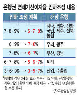 최대 연체상한율도 인하된다. KB국민은행은 3%p, 우리은행과 신한은행 등 9개 은행은 2%p, 씨티은행 등 3개 은행은 1% 내외로 인하를 추진할 예정이다.