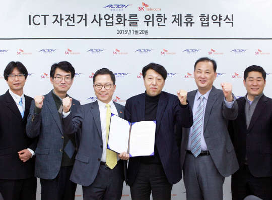 조승원 SK텔레콤 솔루션영업2본부장(왼쪽 세번째)과 박찬우 알톤스포츠 대표이사(네번째)가 20일 서울 송파구 방이동 알톤스포츠 본사에서 정보통신기술(ICT) 기반의 자전거 개발을 위한 양해각서(MOU)를 체결한 후 양사 관계자들과 기념 촬영하고 있다.