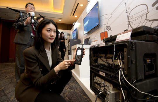 중국 화웨이가 28일 서울 소공동 롯데호텔에서 '화웨이 LTE 기반 재난망 시연회'를 개최하고, 국내 재난안전통신망 구축사업에 참여하겠다고 밝혔다. IT강국인 한국에서 공공 재난망 장비 수주 경험을 쌓고, 이를 발판 삼아 세계 재난망 네트워크 시장 입지를 넓히려는 것으로 풀이된다. 화웨이코리아 직원이 LTE 기반 무전기 등 재난망 장비를 선보이고 있다.