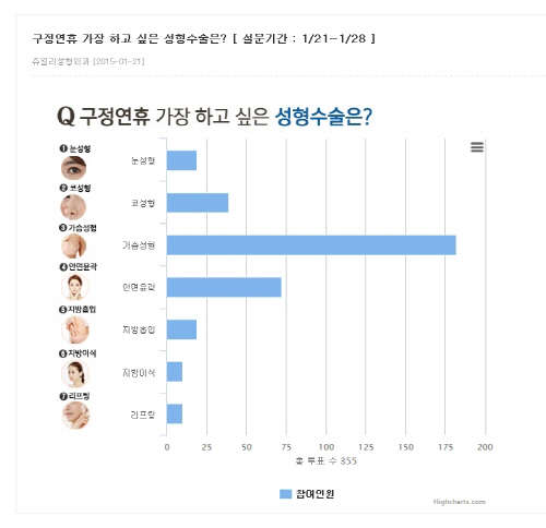 쥬얼리성형외과는 지난 1월 21일부터 28일까지 홈페이지를 통해 '설 명절 황금연휴 성형수술 선호도'에 대한 설문조사를 한 결과, 총 354명 중 가슴성형을 선택한 인원이 50.8%(180명)로 가장 많았다고 밝혔다.