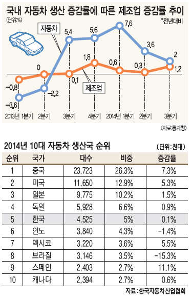 자동차 생산이 제조업 전체 경쟁력에 미치는 영향은 상당하다. 통계청에 따르면 2013년 1분기 자동차 생산이 전년보다 3.6% 감소하자 제조업 생산도 0.8% 감소했다. 자동차 생산이 올라가면 제조업도 따라갔다. 즉, 자동차 생산성과 제조업 경쟁력은 같은 방향으로 흘러간다는 뜻이다.