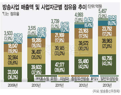방송통신위원회는 '2014년도 방송시장경쟁상황평가'를 통해 8일 이같이 밝혔다. 평가에 따르면 지난 2013년 말 기준 방송시장 전체 규모는 전년 대비 6.3% 증가한 14조347억원을 기록했다.