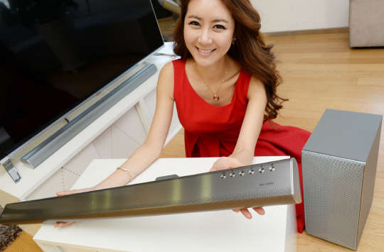 LG전자는 고품질 사운드를 구현하는 2015년형 '사운드 바 (LAS750M)'2종을 국내시장에 출시한다고 9일 밝혔다. 4.1채널에 360와트(W)의 웅장한 음향을 제공하는 이 제품은 가로로 긴 형태의 스피커로, 사용자들이 TV나 다른 스마트 기기와 연동할 수 있도록 블루투스·와이파이 기능을 지원한다. LG전자 모델이 9일 LG트윈타워에서 와이파이가 지원되는 2015년형 LG '사운드 바' 신모델(LAS750M)'을 소개하고 있다.
