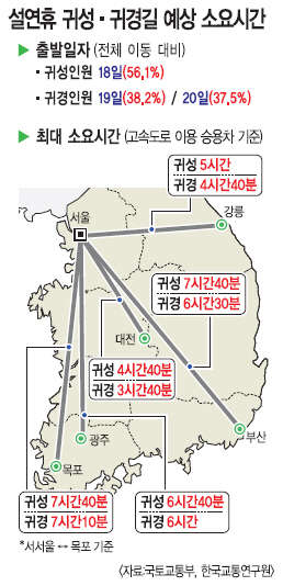 귀성길 최대 소요시간은 서울에서 부산이 7시간 20분, 서울에서 광주는 6시간 40분에 이를 것으로 보인다. 귀경길은 부산에서 서울이 6시간 30분, 광주에서 서울이 6시간 걸릴 것으로 예상됐다.