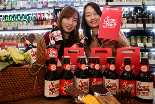 10일 모델들이 현대백화점에서 밸런타인데이를 맞아 출시한 맥주 '썸앤썸(Some&Some)'을 선보이고 있다. 현대백화점이 3000병 한정으로 선보이는 초콜릿을 가미한 맥주 '썸앤썸'은 유명 브루마스터인 마크 헤이먼이 만든 브라운 에일 맥주로 초콜릿 풍미가 더해진 것이 특징이다.