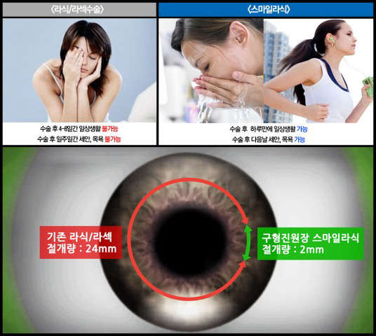 한편 스마일라식은 평균 3~4mm의 각막최소절개술을 통해 수술이 진행된다. 각막의 절개부위가 최소화 된 만큼 각막신경의 손상도 최소화 되므로 안구건조증, 빛 번짐 등의 부작용 발생률 또한 현저히 낮출 수 있는 것이다.