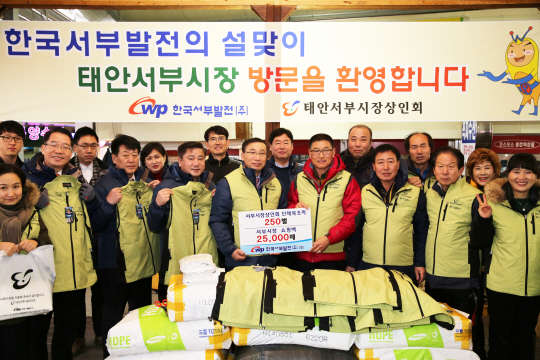 한국서부발전이 설을 앞두고 전통시장 활성화를 위해 자체 제작한 조끼 250벌과 쇼핑백 2만5000개를 태안 전통시장인 서부시장 상인회에 전달하고 시장에서 500만 원 상당의 생활용품 등을 구입했다.