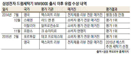 삼성전자는 22일 자사 블로그 '삼성 투모로우'를 통해 '크리스털 블루 도어 드럼세탁기(WW9000)' 모델이 출시 직후 최근까지 유럽 각국의 소비자 평가 매거진으로부터 최고의 평가를 받았다고 밝혔다.