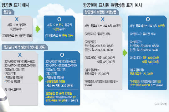 예컨대 '항공운임 등 총액(편도) 5만5000원'으로 적고 '유류할증료와 해외공항 시설이용료는 발권일·환율 등에 따라 변동될 수 있다'는 단서를 달아야 합니다. 항공운임 등 총액이 편도인지 왕복인지 여부를 소비자가 쉽게 알 수 있도록 표시해야 하고 변동될 수 있는 유류할증료, 시설이용료 등에 대한 안내도 해야 합니다.