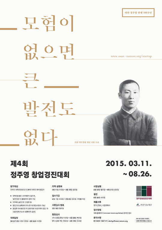 아산나눔재단은 창업 문화 확산 및 유망 스타트업 발굴을 위해 '제4회 정주영 창업경진대회'를 개최한다고 2일 밝혔다.