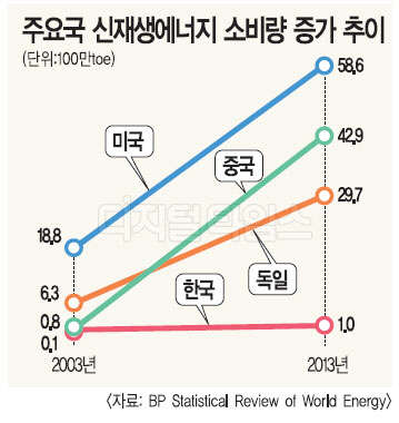 이러는 사이 우리나라 신재생에너지 산업은 사실상 제자리 걸음만 하고 있다. 중국은 10년 전만 해도 우리와 같이 소비량 100만석유환산톤(toe) 미만의 신재생에너지 후발주자였다. 하지만, 2013년 4290만toe로 10년 전보다 54배 늘어나 전 세계 소비량 중 15.4%를 차지하며 세계 2위의 신재생에너지 국가로 도약했다. 우리나라는 같은 기간 신재생에너지 소비량이 10만toe에 100만toe로 늘었지만 여전히 점유율이 세계 시장의 0.4%에 불과할 정도로 미미하다.