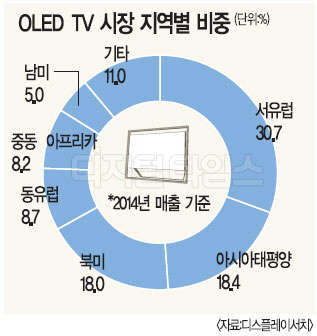 지역별로는 프리미엄TV 수요가 많은 서유럽이 전체 30.7%를 차지했으며, 아시아·태평양이 18.4%, 북미가 18%로 뒤를 이었다. 분기별로는 지난해 1분기 4600대 판매에 그쳤으나 같은 해 4분기에는 4만2400대나 팔려 갈수록 성장세가 빨라지는 분위기다.