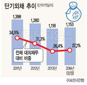이 중 단기외채는 1153억달러로 전체 대외채무에서 차지하는 비중이 2013년 말 26.4%에서 27.1%로 높아졌다. 단기외채 비중은 경상수지·외환보유액과 함께 국가의 대외지급능력을 측정하는 대표적인 지표다. 단기외채에 포함되는 만기 1년 미만의 회사채, 차입금 등은 국제금융시장의 변동성이 커지면 한꺼번에 빠져나갈 가능성이 높다. 단기외채 비중은 글로벌 금융위기가 발생한 2008년 9월 말에 51.9%를 정점을 찍었고, 2013년에는 이후 처음으로 20%대로 떨어졌다. 단기채무에 대한 대외지급 능력을 나타내는 외환보유액 대비 단기외채 비율은 1년 사이 32.3%에서 31.7%로 낮아졌다. 2008년 이후 가장 낮은 수준이다.