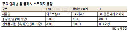 18일 관련 업계에 따르면, EMC, HP, 퓨어스토리지 등 스토리지 업체들은 올해 안에 기존보다 용량이 2배 이상 향상된 고용량 올 플래시 스토리지를 출시할 예정이다. 업계는 개선된 확장성을 바탕으로, 판매 전략을 일반 업무 영역까지 확대해 올 플래시 스토리지 대중화의 원년으로 삼겠다는 전략까지 세웠다.