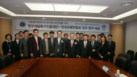 18일 김차동 연구개발특구재단 이사장(앞줄 왼쪽 네번째)과 하영구 전국은행연합회장(다섯번째)이 '기술금융 활성화를 위한 업무협약'을 체결하고 기념촬영을 하고 있다.