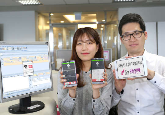 LG유플러스는 기존 유선에서 제공하던 컨택센터(콜센터) 기능을 스마트폰으로 사용할 수 있는 유무선 통합상담 서비스 'U+비즈 모바일 컨택'을 출시한다고 2일 밝혔다. 기업의 고객관계관리(CRM)서버를 모바일 애플리케이션과 연동해 정보조회, 상담 메모, 가입자간 무료통화, 중앙 녹취와 관리, 기업용 메신저 등을 스마트폰으로 이용할 수 있다. 회사 직원들이 'U+비즈 모바일컨택' 서비스 출시를 알리고 있다.