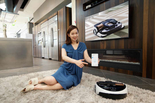 삼성전자는 스마트폰으로 조작 가능한 진공흡입 로봇청소기 '파워봇' 신모델을 출시한다고 2일 밝혔다. 스마트폰에 '삼성 스마트홈 앱'을 설치하고 파워봇을 와이파이와 연결해 제품 등록하면 집 밖에서도 조작할 수 있다. 삼성전자 모델이 2일 서울 논현동 삼성 디지털프라자 강남본점에서 '파워봇' 신모델을 소개하고 있다.