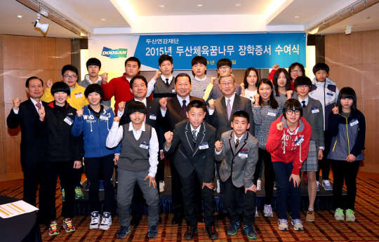 김정행 대한체육회장이 지난 3일 서울 중구 앰배서더 호텔에서 열린 '두산체육꿈나무 장학증서 수여식'에서 체육꿈나무 선수들과 기념촬영을 하고 있다. 두산연강재단은 이날 체육 유망주 20명에게 총 1억원의 장학금과 기념품을 전달했다.