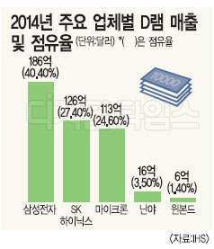 8일 시장조사업체 IHS에 따르면 삼성전자는 지난해 D램 부문에서 매출 186억6100만달러(한화 20조4076억원)를 달성했다. 2013년(126억7800만달러)과 비교해 D램 매출액이 47% 성장한 셈이다. 세계 D램 시장점유율도 전년보다 4.2%포인트 상승한 40.4%를 기록해 2위인 SK하이닉스와 격차를 13%포인트로 벌렸다.