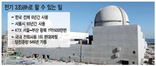 한수원은 3조㎾h를 다른 에너지원으로 발전할 경우 석유는 796조8000억원, LNG는 595조8000억원, 유연탄은 311조5000억원의 추가 비용이 발생한다며 원전을 주축으로 한 우리나라의 낮은 전력요금이 산업경쟁력 향상에 크게 기여했다고 설명했다.