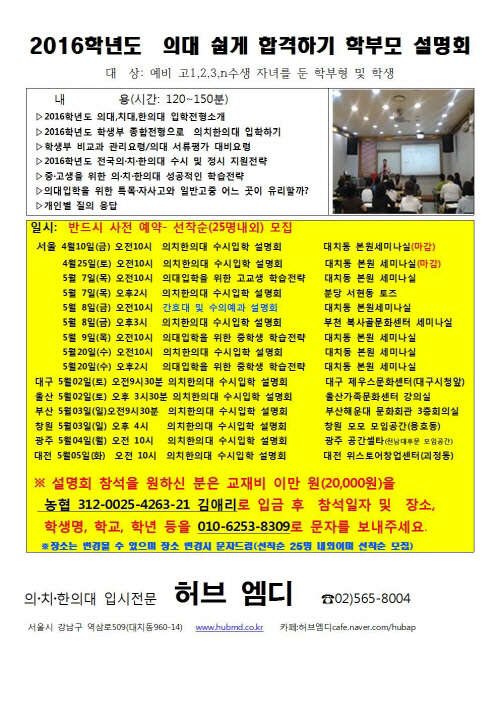 의대입시 전문학원 허브엠디에서는 오는 25일 오전 10시부터 다음달 9일까지 '2016년 의o치o한의대 수시입학설명회 및 의대캠프'란 주제로 고1o2o3학년과 중1o2o3학년 자녀를 둔 학부모를 대상으로 의대 입시 설명회를 강남, 부산, 울산, 대구, 창원, 광주, 대전, 부천, 분당에서 가진다. 설명회는 유료(2만원)로 실시되며, 25명 이내로 선착순 모집하므로 반드시 전화로 사전 예약을 해야 한다(홈페이지 참조).