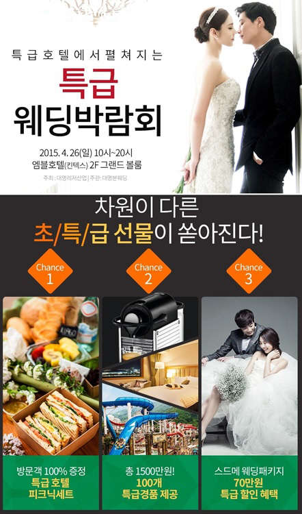 결혼식 준비가 막막하다면 웨딩박람회 참가를 통해 유용한 정보 및 도움을 제공받는 것이 유리하다. 오는 4월 26일 10~20시, 일산 킨텍스 엠블호텔에서 개최할 예정인 특급 웨딩박람회는 예비 부부들의 결혼 준비를 체계적으로 도와 줄 유용한 행사다. 특급 웨딩박람회는 대명레저산업 주최, 대명본웨딩 주관으로 시행된다. 대명본웨딩은 이번 특급 웨딩박람회를 통해 2015년도 유행하는 획기적인 웨딩 스타일을 중점적으로 선보인다는 계획이다.
