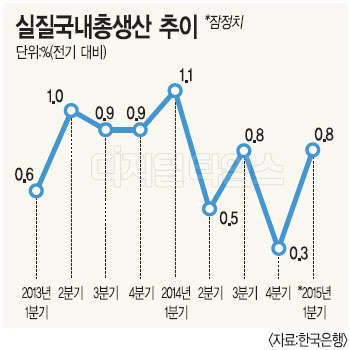 분기 성장률은 2012년 3분기 0.4%에서 2013년 2분기 1.0%로 올랐지만 같은 해 3분기와 4분기에는 각각 0.9%로 낮아졌다. 지난해 1분기는 1.1%로 반등하는 듯했지만 세월호 사고가 발생한 2분기에는 0.5%로 반 토막이 났고, 3분기 0.8%, 4분기 0.3%까지 떨어지는 등 올 1분기까지 4분기 연속 0%대 성장률을 기록했다.