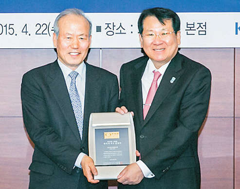 허태석 한국능률협회 CS위원회 위원장(왼쪽)이 지난 22일 서울 을지로 외환은행 본점에서 김한조 외환은행장에게 'KSQI 한국산업의 서비스품질지수' 평가조사 시중 은행 콜센터 부문 1위 인증패를 수여한 후 기념촬영을 하고 있다.