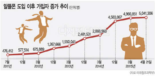 미래창조과학부는 알뜰폰 가입자 수가 지난달 21일 기준으로 504만명, 전체 이동통신시장 점유율 8.79%를 기록했다고 밝혔다. 미래부 출범 당시인 지난 2013년 3월말 155만명, 점유율 2.88%에 불과하던 알뜰폰 가입자는 한 달 평균 13만9000명씩 꾸준히 늘어나 약 2년 만에 3.2배 증가했다.