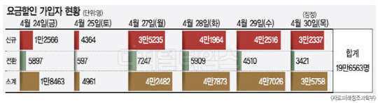 일자별로는 지난달 24일 1만2566명, 25일 4364명, 26일(일요일으로 전산 개통하지 않음), 27일 3만5235명, 28일 4만1964명, 29일 4만2516명, 30일 3만2337명(잠정치)이 새로 가입한 것으로 나타났다.