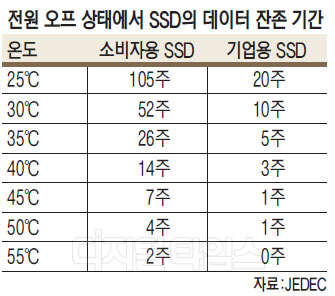 12일 국제 반도체공학 표준 협의기구(JEDEC)에 따르면 기온은 SSD의 데이터 잔존율(Data Retention)에 치명적인 악영향을 미친다. 최근 인텔의 SSD 제품을 실험한 JEDEC는 전원이 들어오지 않은 상태에서 SSD가 일정 온도에서 성능이 성능과 수명, 신뢰성 등이 급격히 떨어진다는 사실을 확인했다.