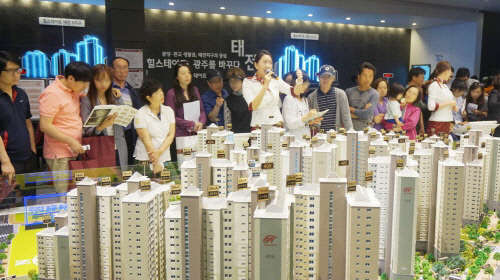 현대건설이 지난 15일 경기 광주시 태전지구에서 본격적으로 분양 몰이에 들어간 '힐스테이트 태전'의 모델하우스 내부에 수 많은 주택수요자들이 방문해 모형도를 관람하고 있다.