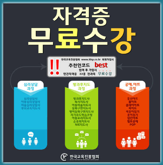 무료 수강 이벤트 참여 방법은 먼저 한국교육진흥협회 홈페이지(http://klsp.co.kr)를 접속한 뒤 회원가입 절차를 진행해야 하며 회원가입시 나타나는 추천인코드에 'best'를 입력하면 22개 전강좌 무료수강이 가능하다.