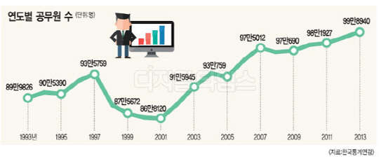 19일 통계청의 '2014년 한국 통계연감'에 따르면 2013년 기준 전체 공무원 수는 99만8940명으로 20년 전인 1999년(89만9826명)보다 9만9114명 늘었고, 5년 전인 2008년과 비교하면 3만256명 증가했다.