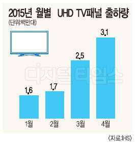 16일 시장조사업체 IHS테크놀로지에 따르면 지난 4월 UHD TV용 LCD 패널 출하량이 300만대를 돌파했다. UHD TV 패널이 월 출하량이 300만대를 돌파한 건 이번이 처음이다. 전체 TV 패널 시장에서 차지하는 비중도 14%로 상승했다. IHS는 이 같은 출하 증가 추세가 이어질 경우 내년 전체 TV 패널 시장에서 4K가 차지하는 비중은 20%에 달할 것으로 관측했다.