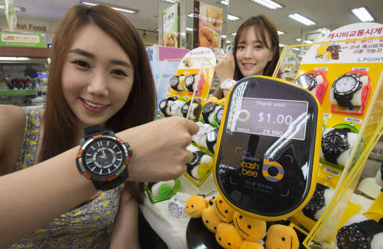 편의점 세븐일레븐이 16일 서울 중구 세븐일레븐 소공점에서 교통카드, 유통점 결제, L포인트카드 기능을 하나의 손목시계에 탑재한 '캐시비워치'를 선보이고 있다. '캐시비워치'는 아날로그 방식의 손목시계에 무선고주파집적회로(RF IC)를 넣어 캐시비카드 기능을 구현했으며 선불 충전 후 대중교통, 택시, 열차 등 결제와 세븐일레븐을 포함한 전국 8만여 가맹점 결제가 가능하다.