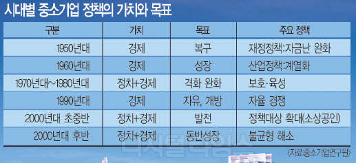 보호·육성→ 자율·개방→ 동반성장 정책 중심 '중기기본법' 1995년 본모습 … 97년 '벤처기업육성 특별법' 제정 김대중 정부선 '벤처창업 붐' 양적 팽창 "경제적 측면서 중기지원"인식전환 시급
