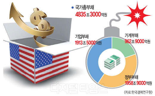 2013년 기준으로 정부와 가계, 기업 등 국가 전체의 부채가 4835조원에 이르는 것으로 조사됐다. 올해 5월까지 집계된 가계부채 증가액만 더해도 국가부채는 5000조원에 육박한다.