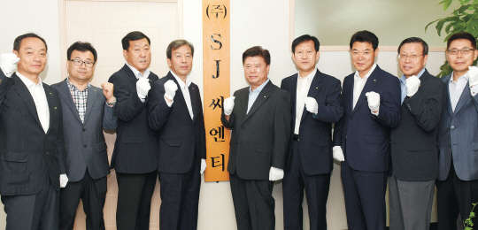 사진은 이석형 중앙회장(현판 오른쪽)과 배상태 SJ씨엔티㈜ 대표(현판 왼쪽) 등이 22일 현판식 후 기념촬영하는 모습.