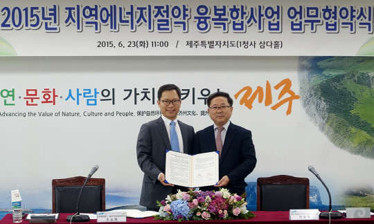 SK텔레콤은 제주특별자치도와 지역에너지 절약 융·복합 사업 추진을 위한 양해각서(MOU)를 체결했다고 23일 밝혔다. 양측은 제주지역 특성을 고려한 ICT와 에너지기술(ET)간의 융·복합 사업을 지원함으로써 제주지역 에너지 절약과 에너지 수요관리의 효율성 제고를 위해 적극 협력키로 했다. 조승원 SK텔레콤 솔루션영업2본부장(왼쪽)과 박홍배 제주특별자치도 경제산업국장이 협약 후 기념 촬영하고 있다.