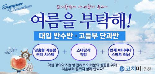 이에 수험생들의 대입합격 100%를 목표로 하고 있는 코치미학원에서는 여름방학 시즌을 효율적으로 보낼 수 있는 특별 관리 프로그램을 이번 모집 수강생들에게 밝힌다.