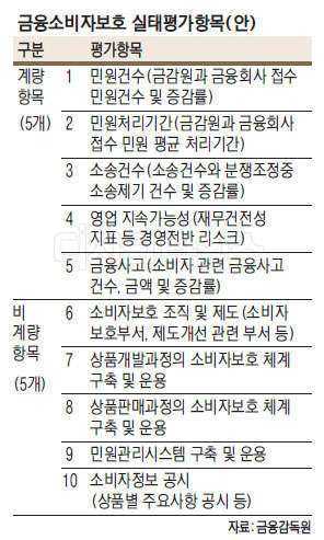 이런 비판에 따라 금감원은 새로운 제도를 마련한 것이다. 금감원은 민원건수, 민원처리기간, 소송건수, 영업지속가능성, 금융사고 등을 계량항목으로 평가할 방침이다. 또 소비자보호 조직 및 제도, 상품개발과정 및 판매과정의 소비자 체계 구축 및 운영, 민원관리시스템 구축 및 운용, 소비자정보 공시 등은 비계량항목으로 평가한다. 금감원은 이들 10개 항목별로 3등급(양호, 보통, 미흡)으로 평가를 실시하되 종합등급은 산정하지 않기로 했다. 평가 결과는 금감원과 금융회사 홈페이지 등에 공개된다. 공개 방식은 어떤 부분에 어떤 미흡한 점이 있었고 이를 어떻게 개선할지, 또 어떤 부분이 잘되지 있는지 내용을 설명하는 방식이다. 금감원은 올해 연말까지 세부 평가기준과 매뉴얼을 만들고 내년 4월부터 올해 금융회사 소비자보호 실태에 대해 최초 평가를 실시할 예정이다.이번 제도 개편으로 금융회사들은 민원 뿐 아니라 소송, 소비자보호 제도 등 다양한 사안을 고민하게 됐다. 또 소송이 많은 보험사들은 상대적으로 안좋은 평가를 받을 수 있어 긴장하고 있다. 그러나 종합등급이 산정되지 않고 중소형 금융사가 자율적으로 평가를 할 수 있게 된 것은 금융회사 관계자들의 심리적 부담을 완화해 줄 것으로 보인다.