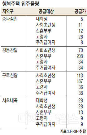 이번에 공급하는 행복주택은 LH가 시행하는 서울 송파구 삼전지구(40가구)와 서울시 SH공사의 강동구 강일지구(346가구), 구로구 천왕지구(374가구), 서초구 내곡지구(87가구) 등이다. 입주자격은 대학생·사회초년생·신혼부부는 서울 또는 연접한 시에 위치한 학교나 직장에 다녀야 하고, 고령자·주거급여자는 서울 거주자여야 한다. 무주택세대 구성원으로 전년도 도시근로자 월평균 소득의 100% 이하(3인 473만4603원)여야 신청할 수 있다.